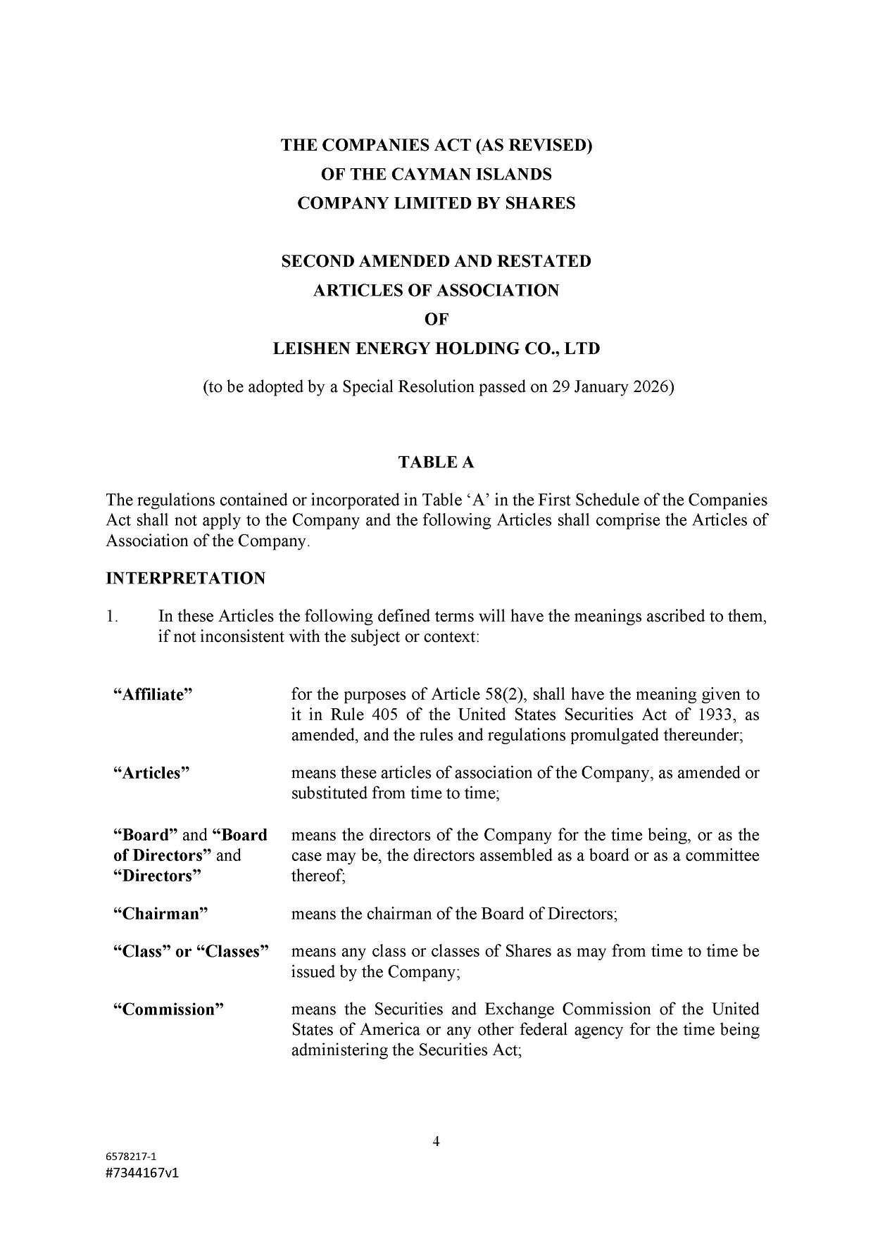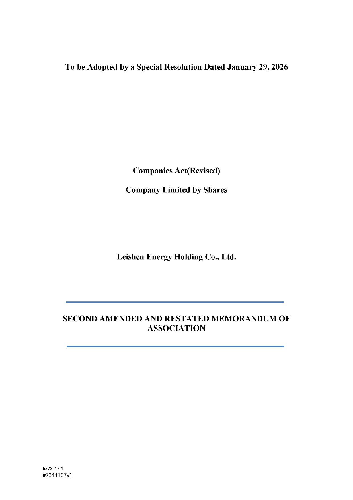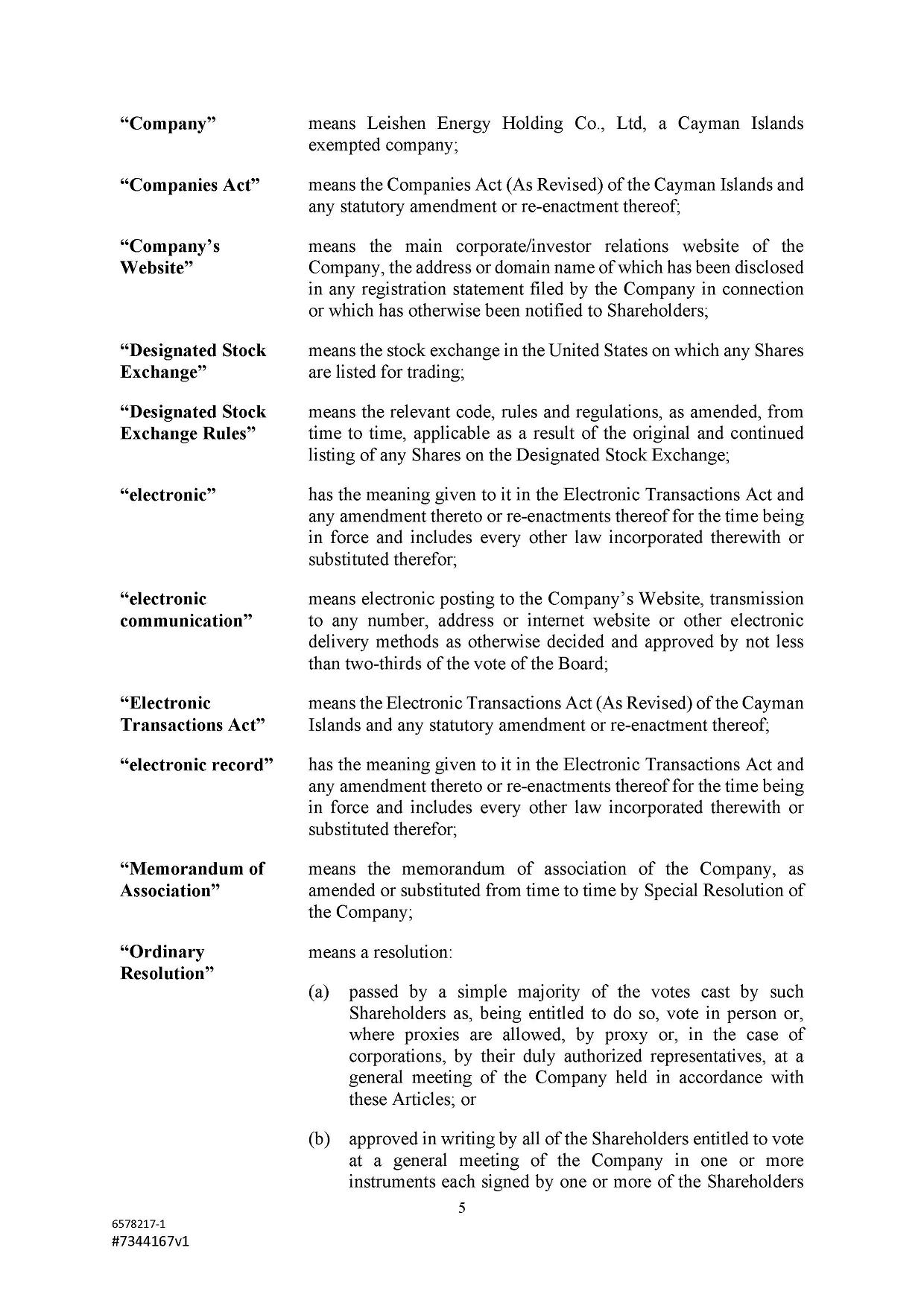 | ● | “Class A Ordinary Shares” are to the Class A ordinary shares of Leishen Energy Holding Co., Ltd., par value US$0.001 per share, each entitled to one (1) vote on all matters subject to vote at general meetings of Leishen Energy Holding Co., Ltd. | |