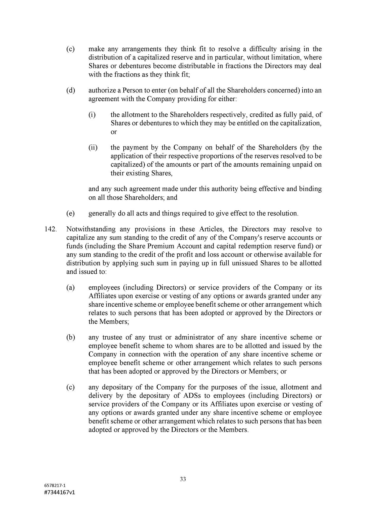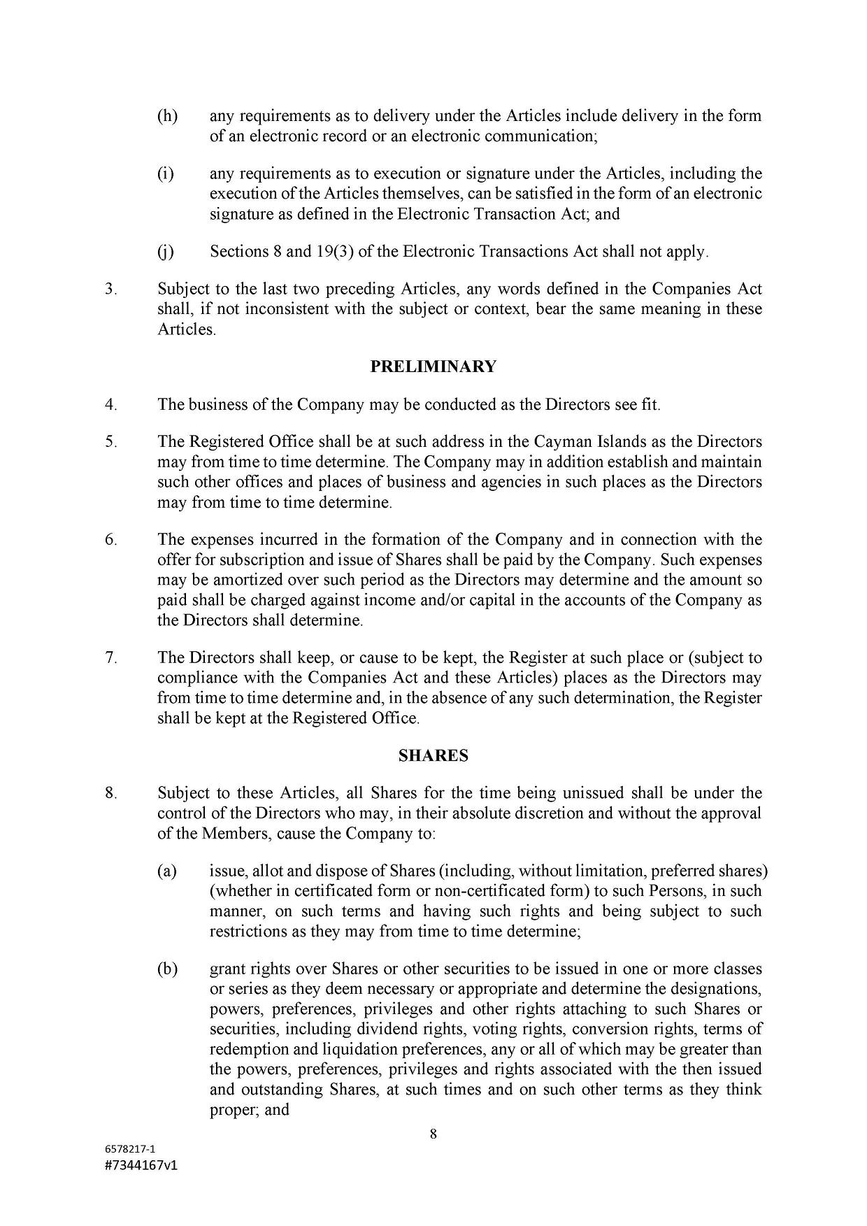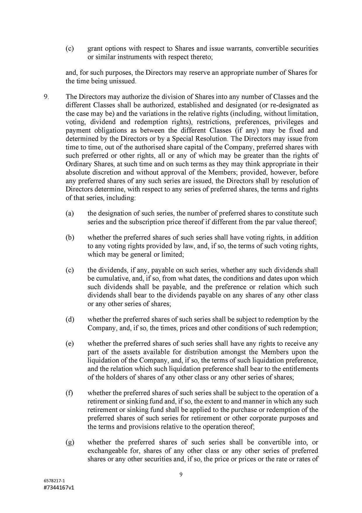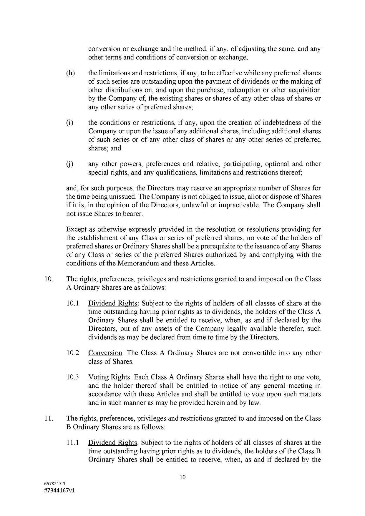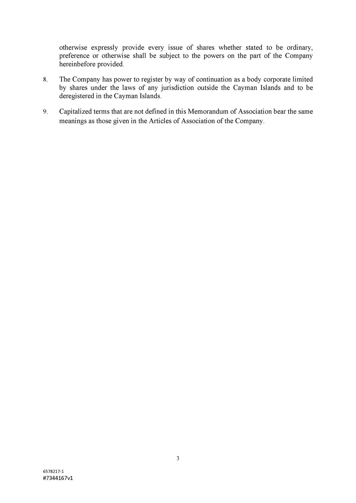 The authorized share capital of the Company is US$500,000 divided into 467,290,000 Class A Ordinary Shares of a nominal or par value of US$0.001 each and 32,710,000 Class B Ordinary Shares of a nominal or par value of US$0.001 each. Subject to the Companies Act and the Articles, the Company shall have power to redeem or purchase any of its Shares and to increase or reduce its authorized share capital and to sub-divide or consolidate the said Shares or any of them and to issue all or any part of its capital whether original, redeemed, increased or reduced with or without any preference, priority, special privilege or other rights or subject to any postponement of rights or to any conditions or restrictions whatsoever and so that unless the conditions of issue shall otherwise expressly provide every issue of shares whether stated to be ordinary, preference or otherwise shall be subject to the powers on the part of the Company hereinbefore provided.