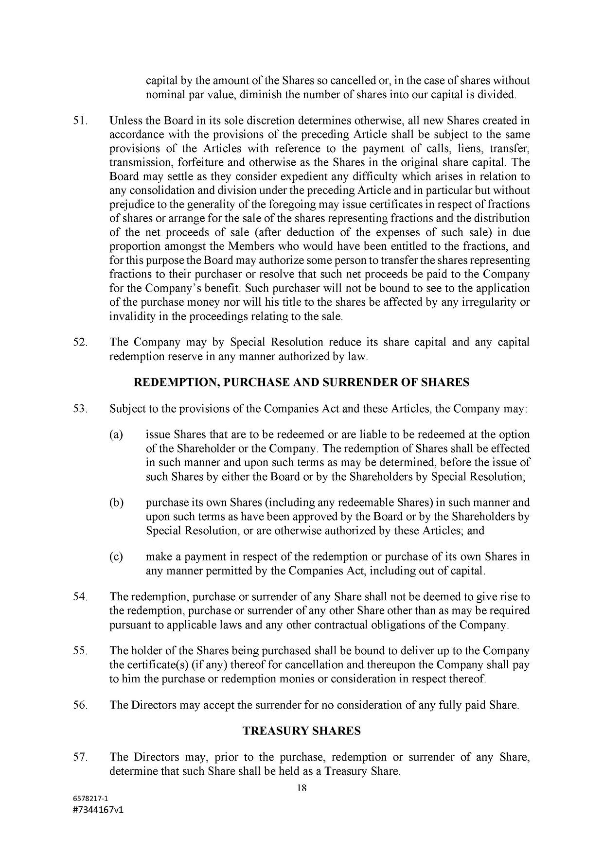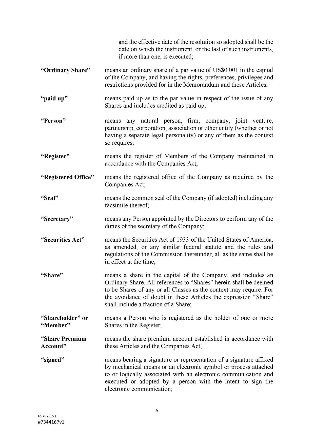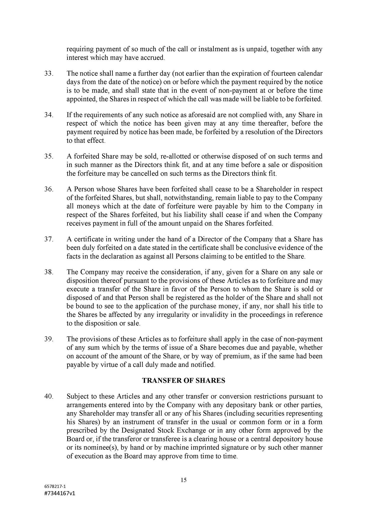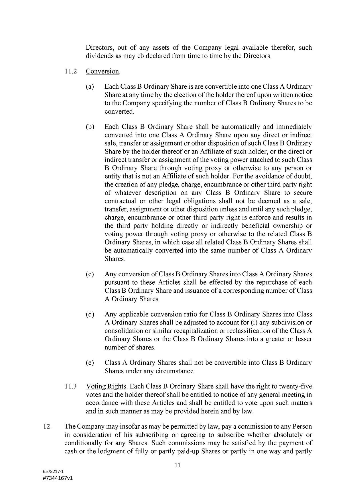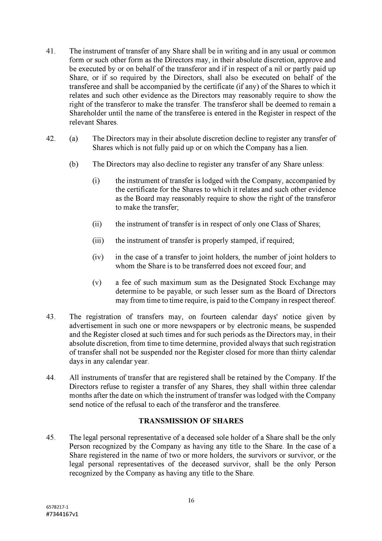 Subject to the Second Amended and Restated Memorandum and Articles of Association and any other transfer or conversion restrictions pursuant to arrangements entered into by the Company with any depositary bank or other parties, any Shareholder may transfer all or any of his Shares (including securities representing his Shares) by an instrument of transfer in the usual or common form or in a form prescribed by the Designated Stock Exchange or in any other form approved by the Board or, if the transferor or transferee is a clearing house or a central depository house or its nominee(s), by hand or by machine imprinted signature or by such other manner of execution as the Board may approve from time to time.