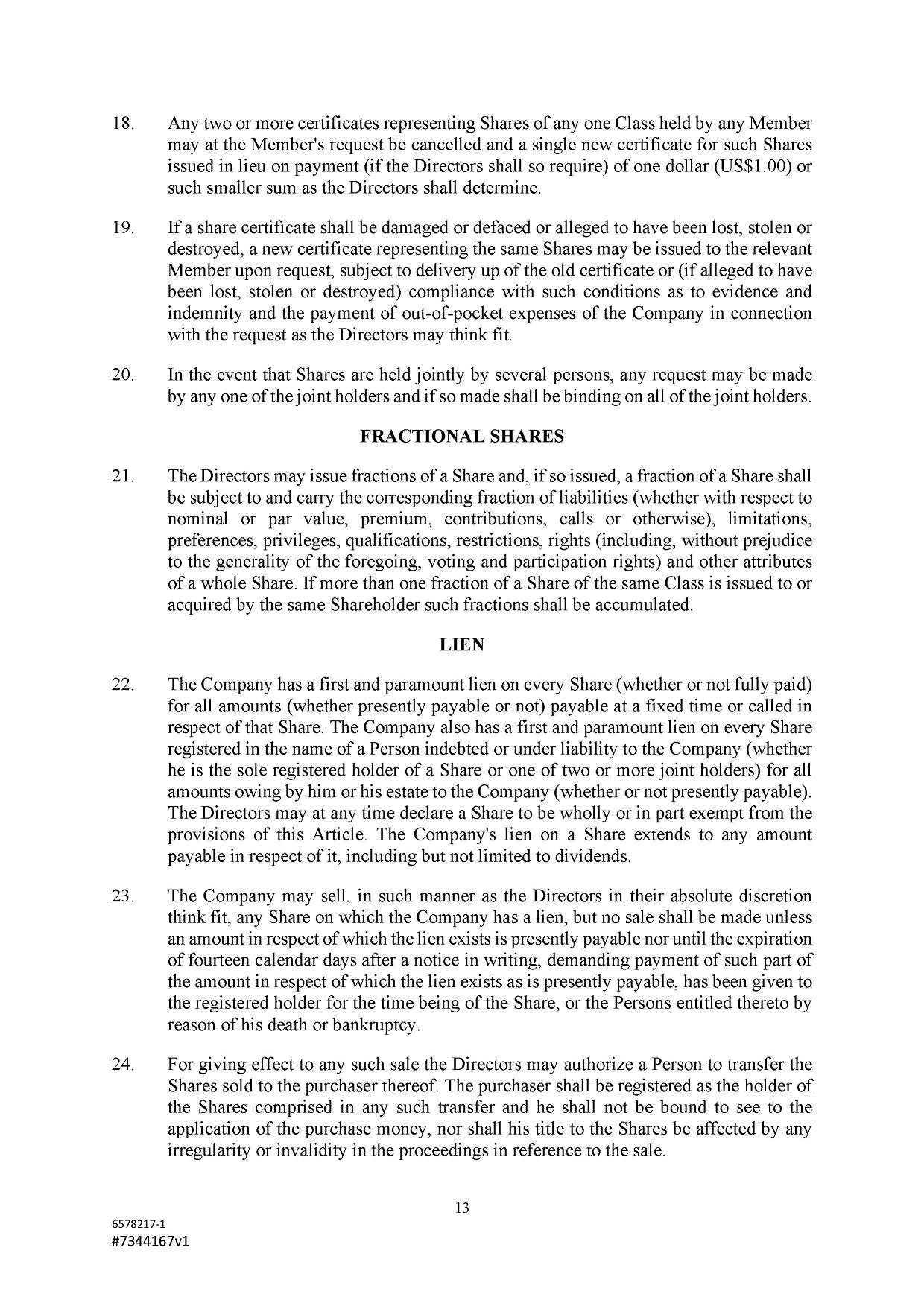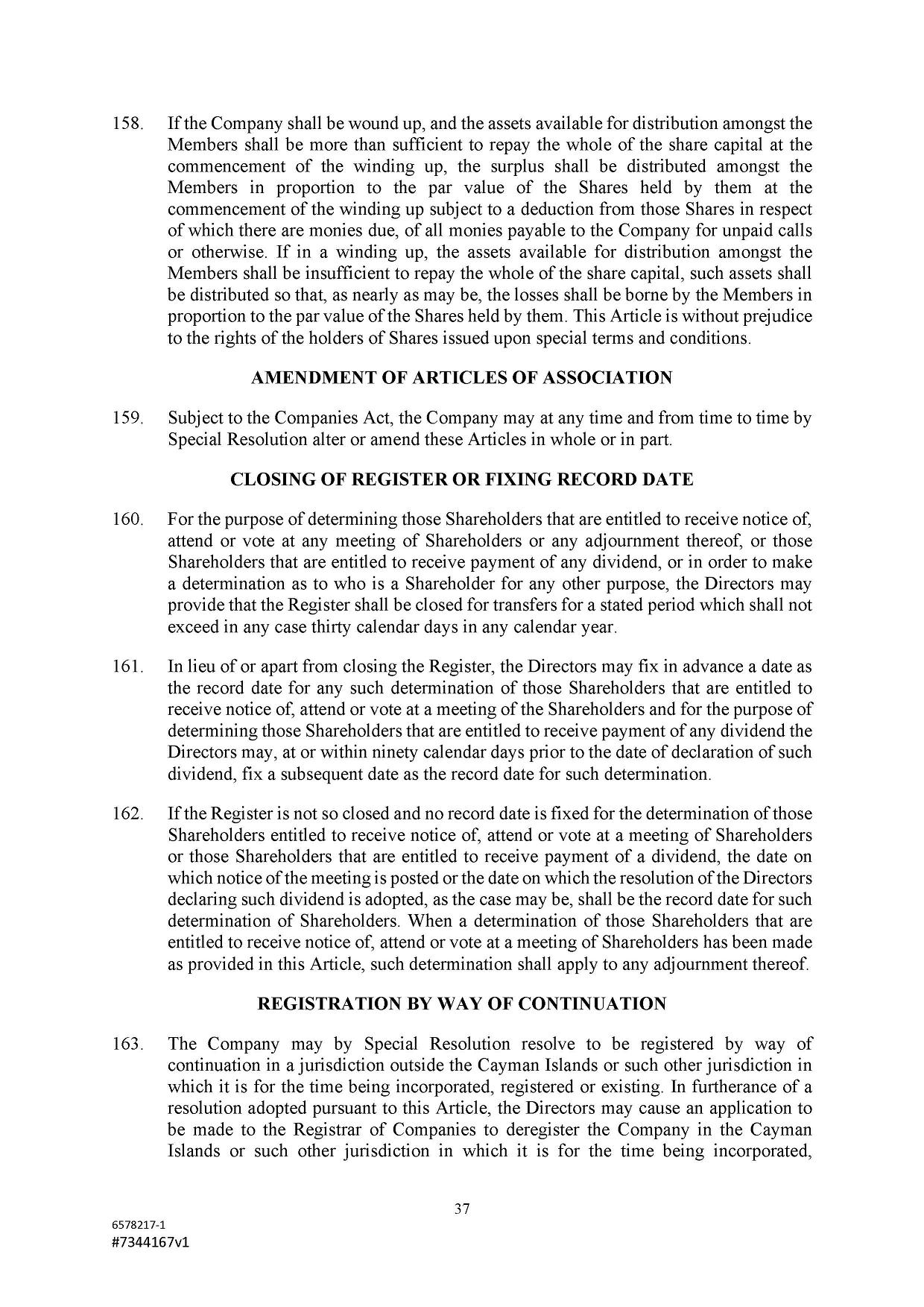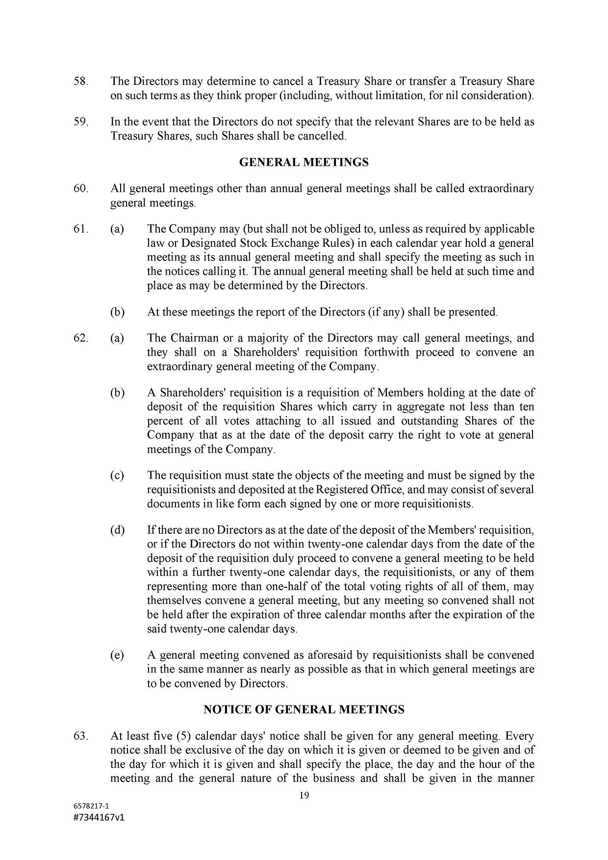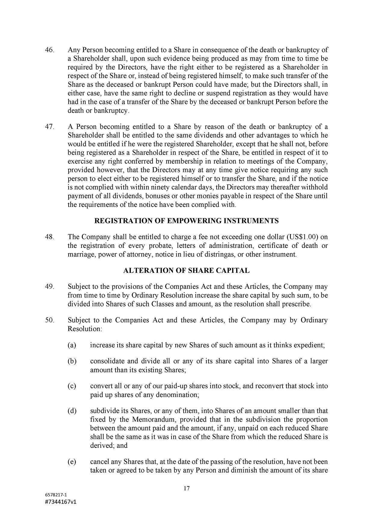 Subject to the Second Amended and Restated Memorandum and Articles of Association and any other transfer or conversion restrictions pursuant to arrangements entered into by the Company with any depositary bank or other parties, any Shareholder may transfer all or any of his Shares (including securities representing his Shares) by an instrument of transfer in the usual or common form or in a form prescribed by the Designated Stock Exchange or in any other form approved by the Board or, if the transferor or transferee is a clearing house or a central depository house or its nominee(s), by hand or by machine imprinted signature or by such other manner of execution as the Board may approve from time to time.