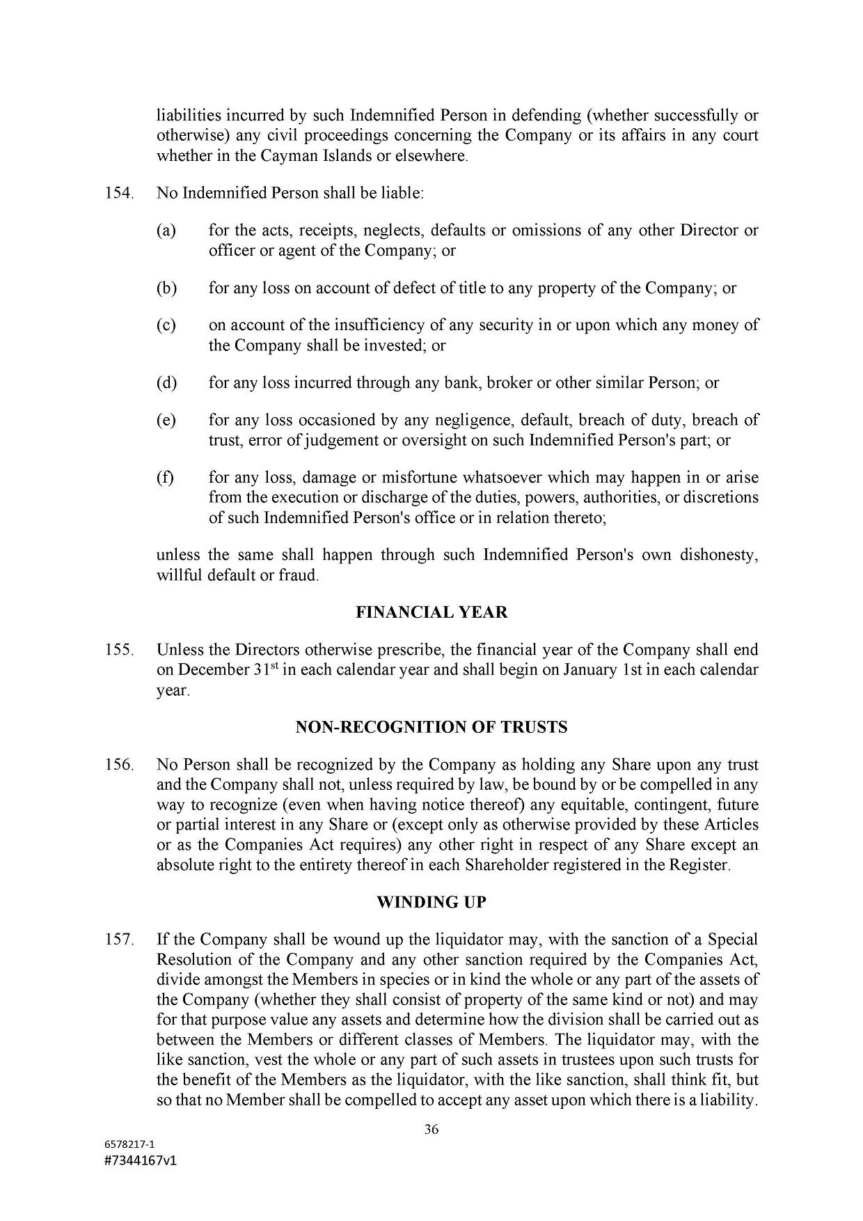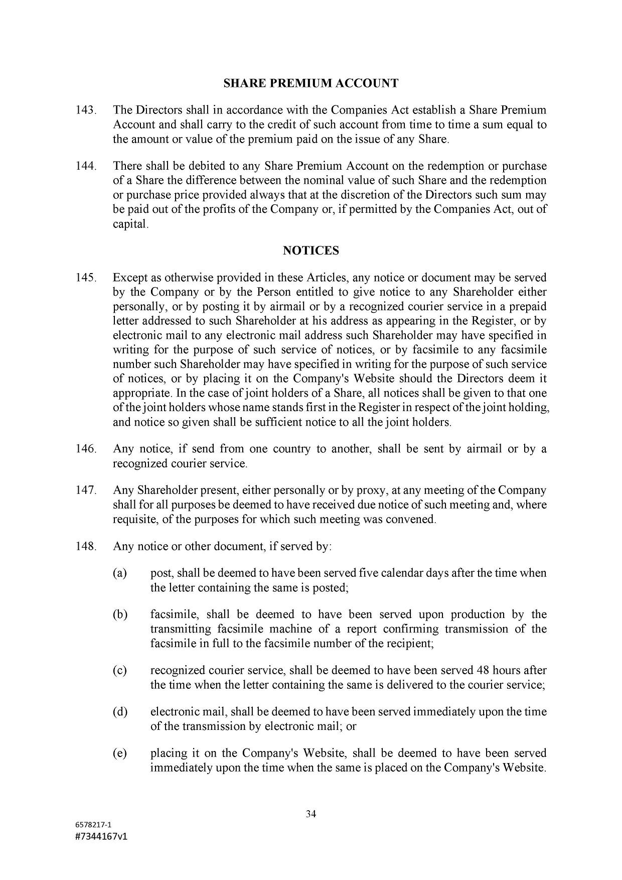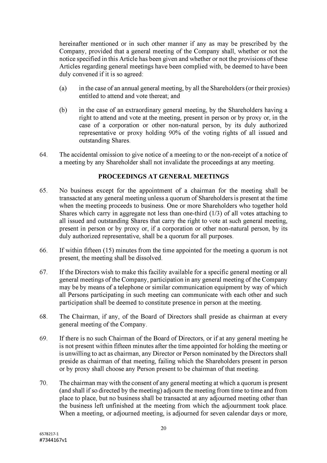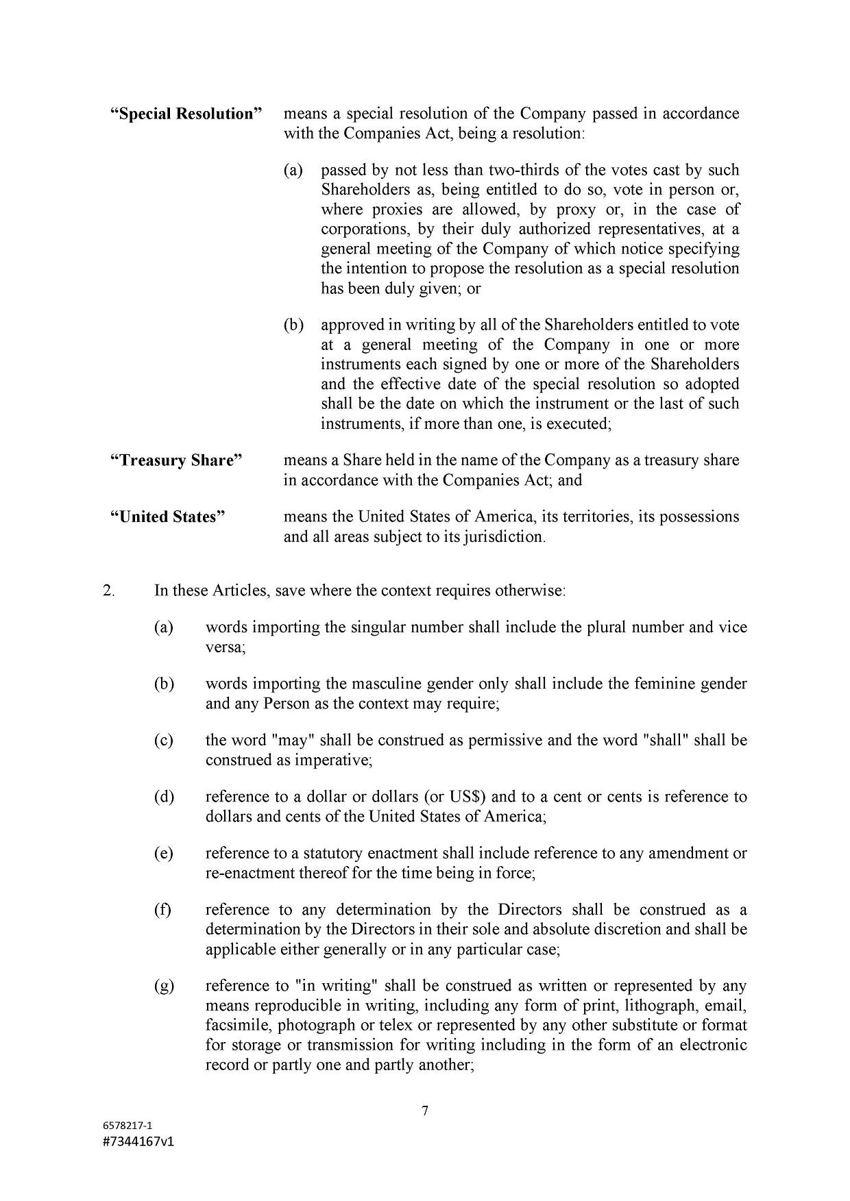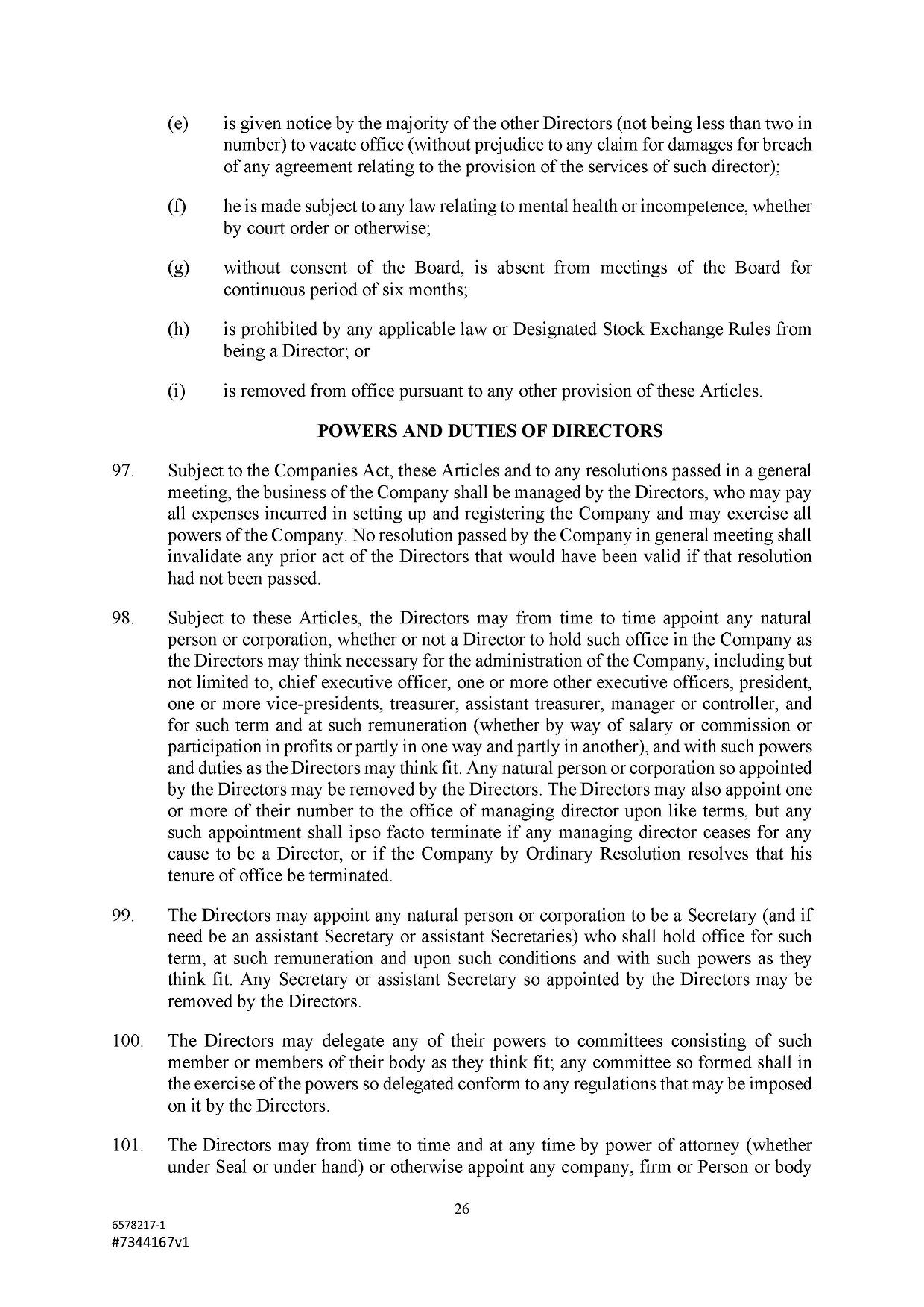 Subject to the Second Amended and Restated Memorandum and Articles of Association and any other transfer or conversion restrictions pursuant to arrangements entered into by the Company with any depositary bank or other parties, any Shareholder may transfer all or any of his Shares (including securities representing his Shares) by an instrument of transfer in the usual or common form or in a form prescribed by the Designated Stock Exchange or in any other form approved by the Board or, if the transferor or transferee is a clearing house or a central depository house or its nominee(s), by hand or by machine imprinted signature or by such other manner of execution as the Board may approve from time to time.