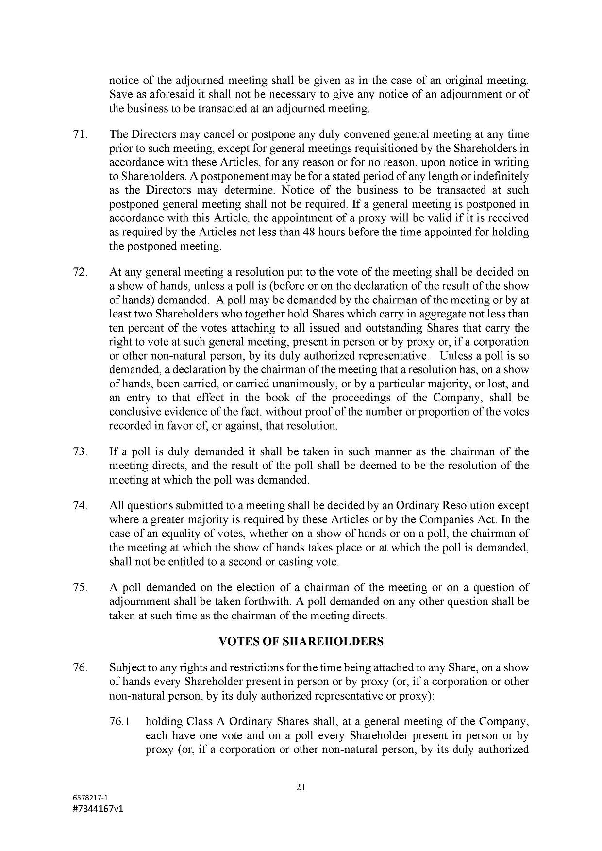 Each Class A Ordinary Shares shall have the right to one vote, and the holder thereof shall be entitled to notice of any general meeting in accordance with these Articles and shall be entitled to vote upon such matters and in such manner as may be provided herein and by law.