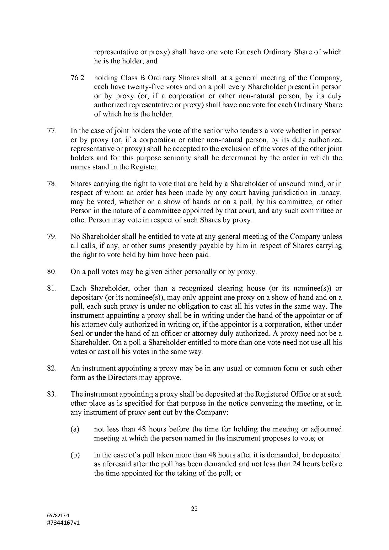 Each Class B Ordinary Share shall have the right to twenty-five votes and the holder thereof shall be entitled to notice of any general meeting in accordance with these Articles and shall be entitled to vote upon such matters and in such manner as may be provided herein and by law.